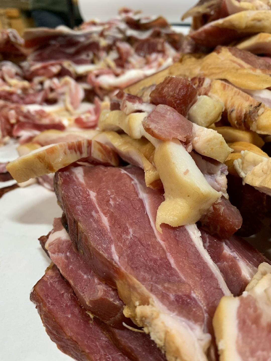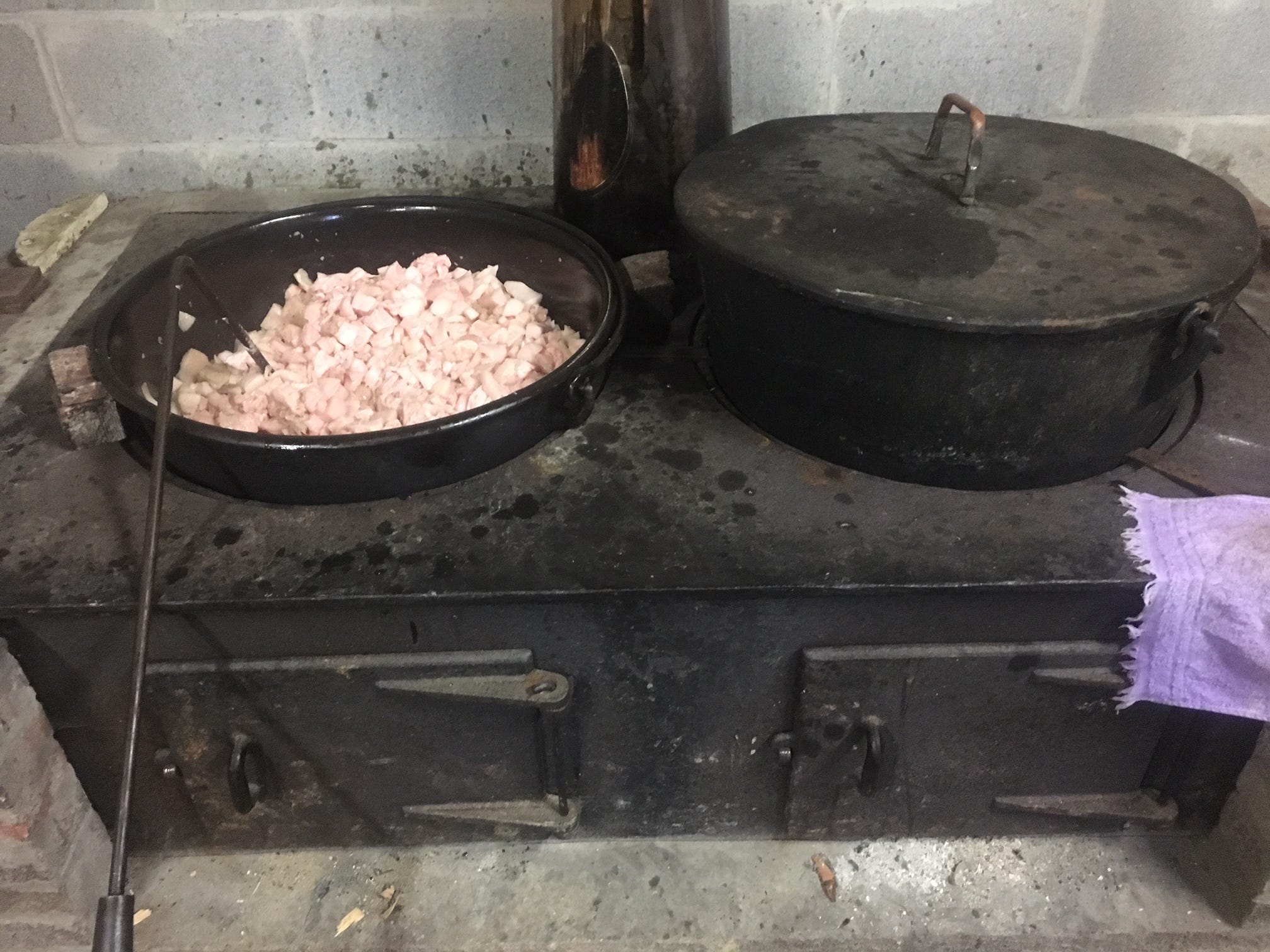 Everyone knows the business. Knives flash, saws buzz, and in a short time, the two long harvest tables – one is a split maple trunk on legs, a foot thick and two feet wide – disappear under layers of chops, bellies, and racks of ribs. Huge hams and shoulders stand up like small mountain ranges; neat stacks of hocks are ricked like firewood. On the big stove, two cauldrons are heating, one of steaming water, the other ready to receive ground fat to be rendered into lard.