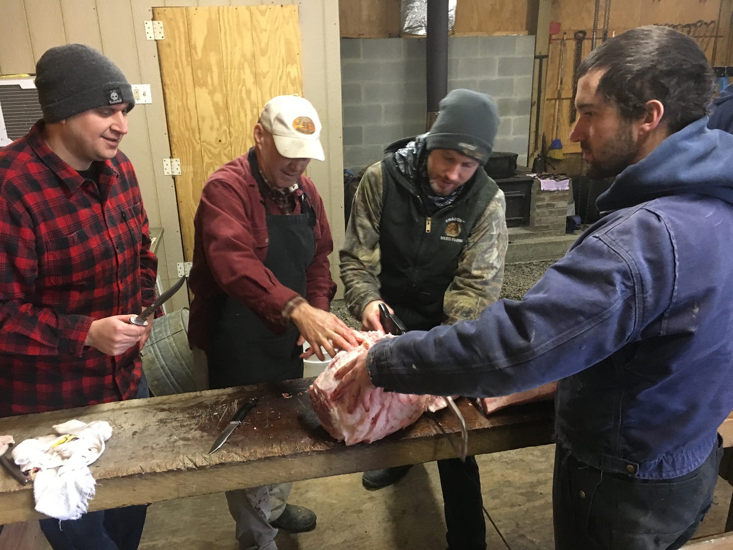 Friday, business gets underway as soon as it’s light, the frosty air crisp with a sense of festival exertion. Breakfasts eaten hastily at home will be made up for in a couple of hours when hot coffee and cinnamon rolls are brought out from the farmhouse kitchen. Right now, though, all is business. As the heavy sides are taken down from their hooks, the children – today this is a new crop of young ones, the children of the original children – stand to one side, sorting through a collection of butchering knives, looking for familiar favorites. These are the up-and-coming butchers, learning their trade from their elders. At the moment, their toes are cold, even through two pairs of socks, and they jostle and shiver; at lunchtime, they’ll run sleds down the hill while the men eat their meal.